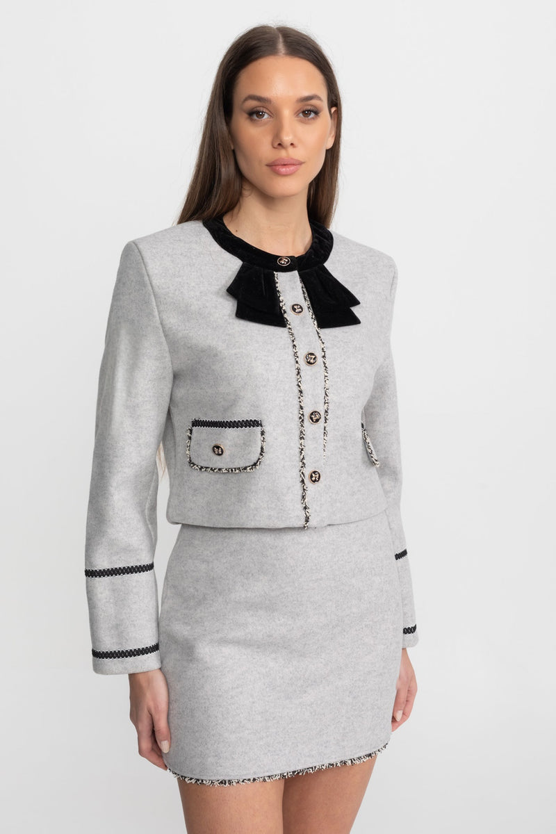 Cropped Jacket with Velvet Bow Collar Accent